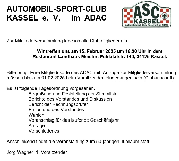 Die Termine des ASC Kassel e.V. im ADAC 2026